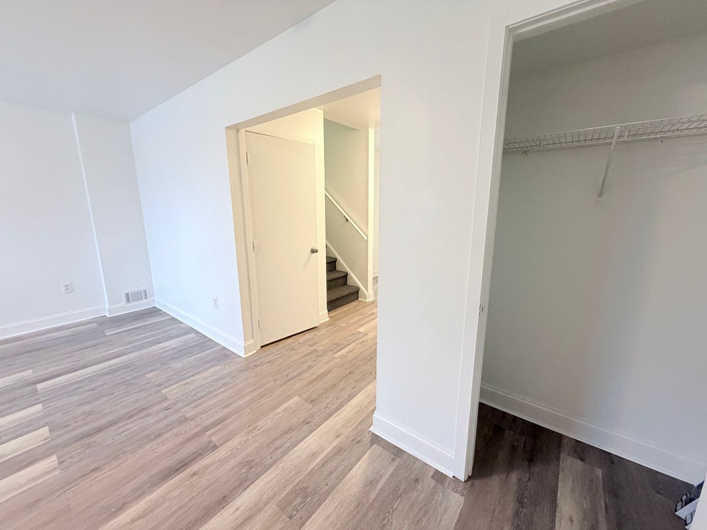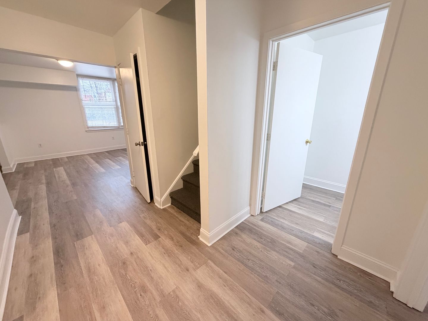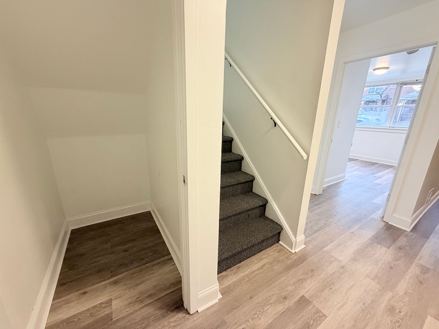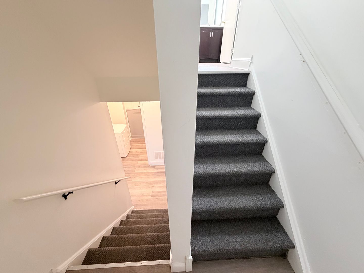 Enter the first floor into your large living room with a coat closet, and through to the kitchen. The spacious kitchen offers tons of counterspace, plenty of cabinets for storage, and gas stove. Also on the first floor is the first bedroom, in unit washer and dryer, and half bathroom for added convenience.