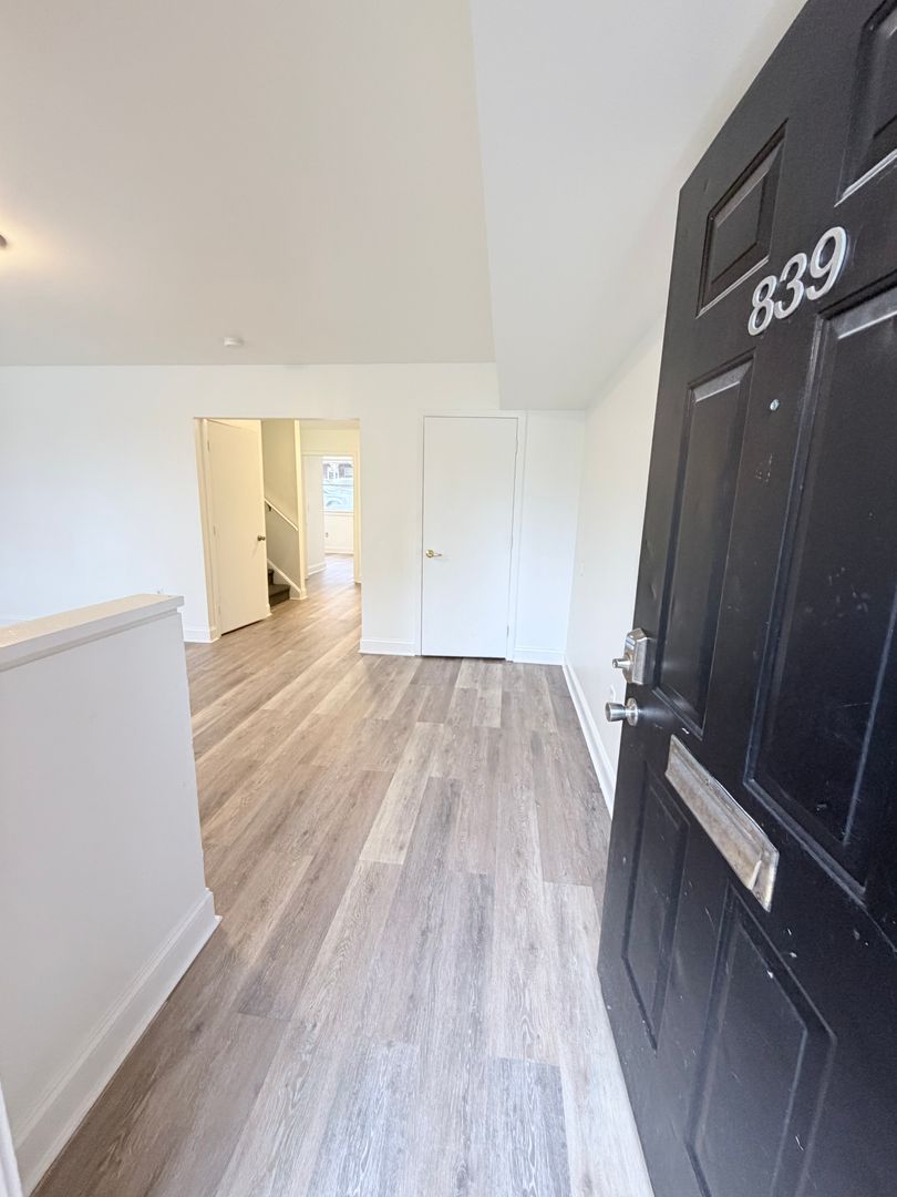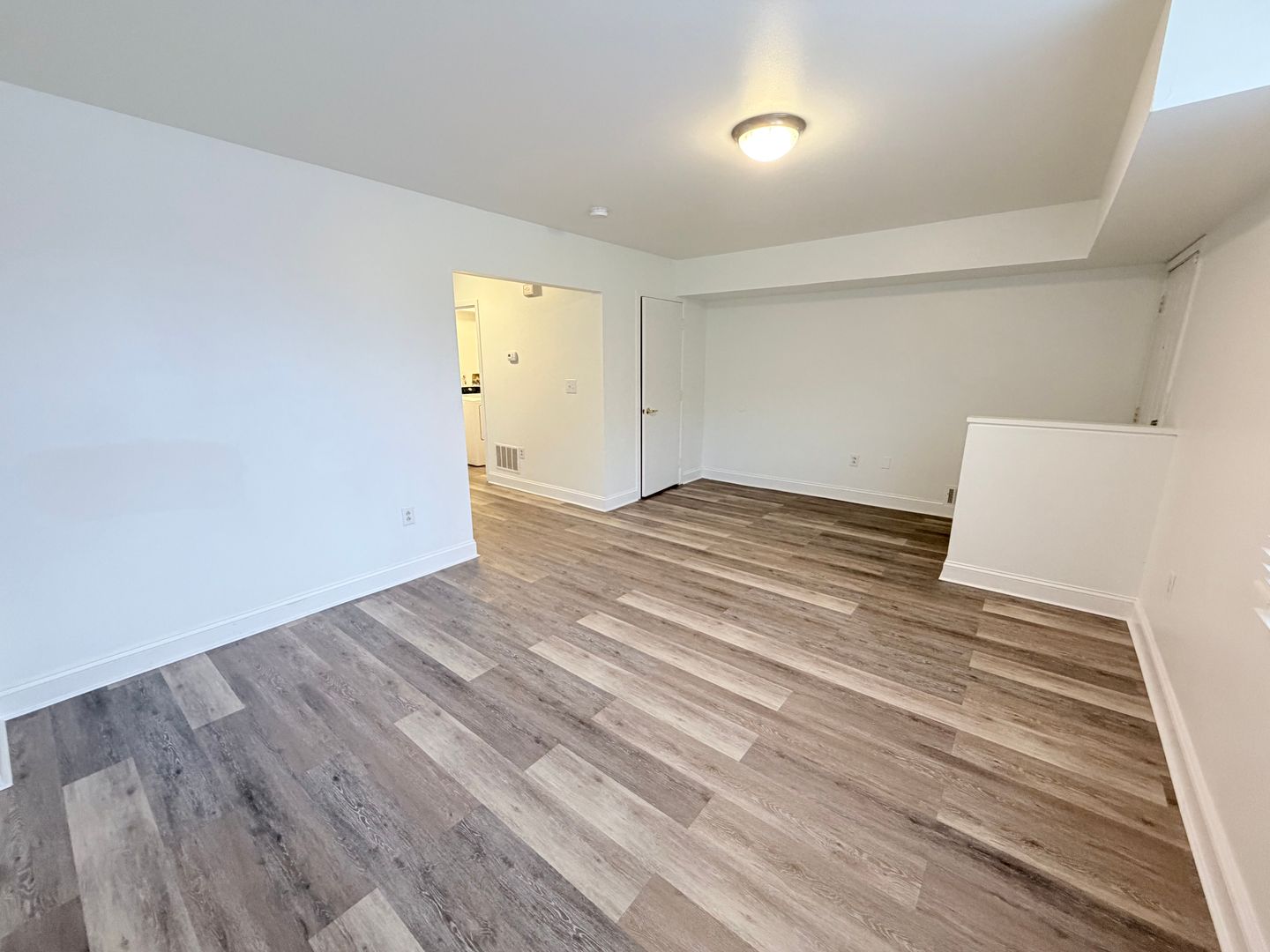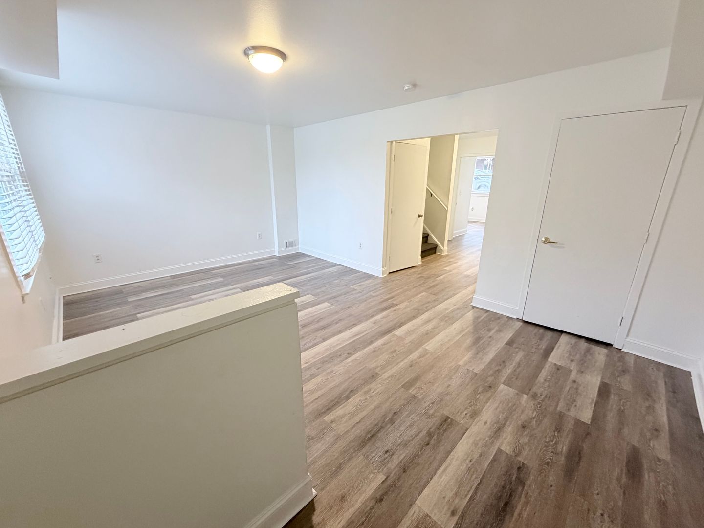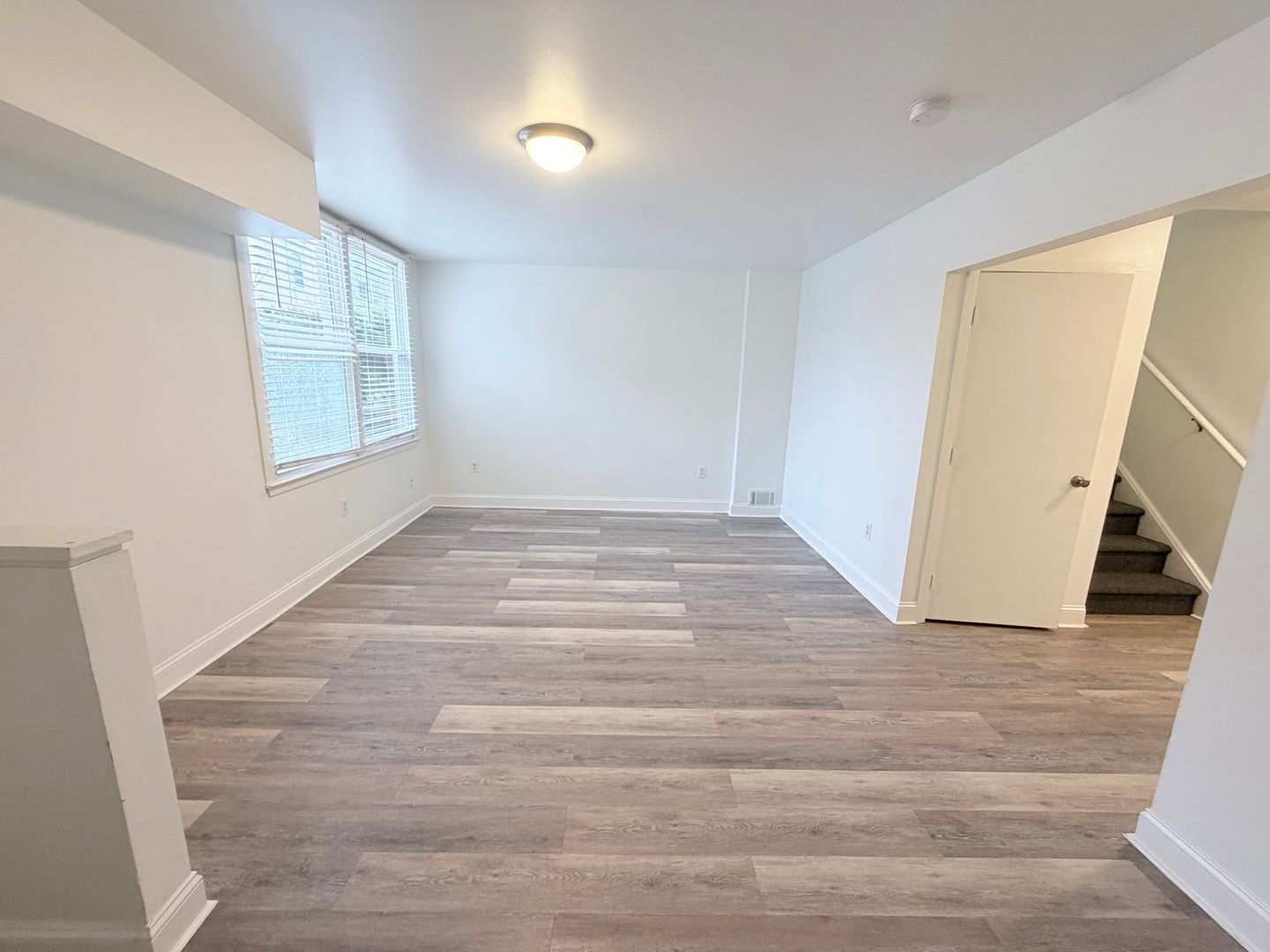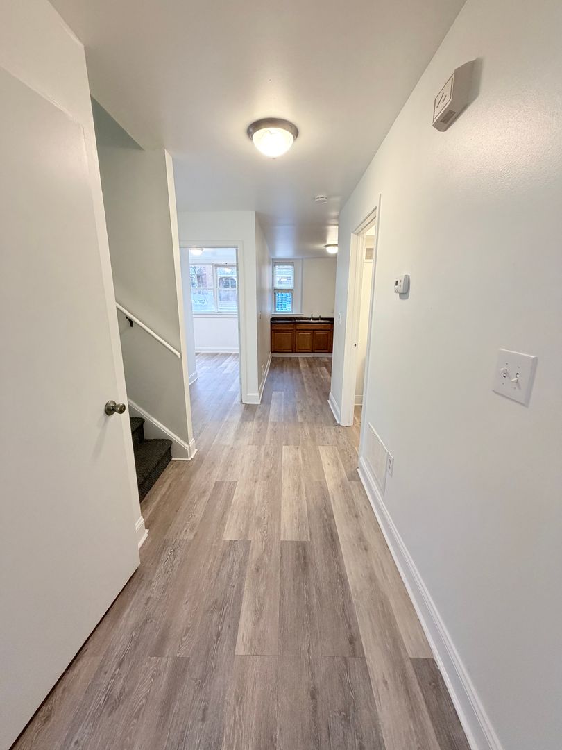 Enter the first floor into your large living room with a coat closet, and through to the kitchen. The spacious kitchen offers tons of counterspace, plenty of cabinets for storage, and gas stove. Also on the first floor is the first bedroom, in unit washer and dryer, and half bathroom for added convenience.