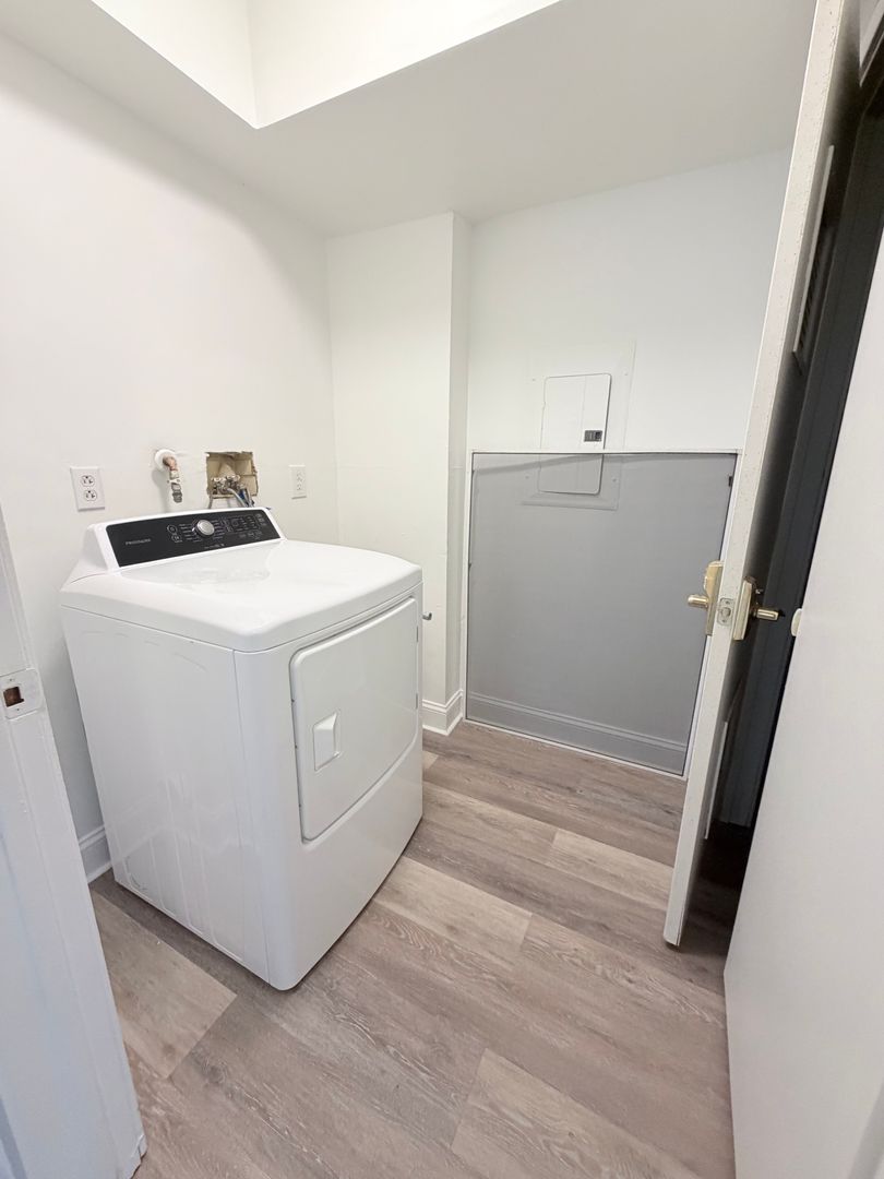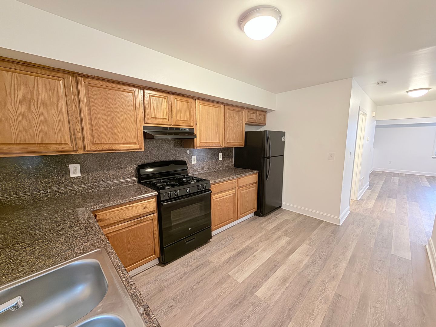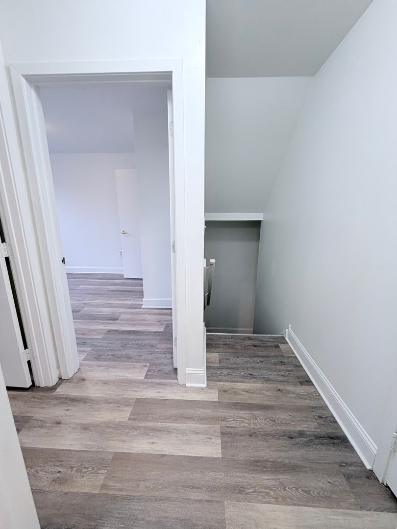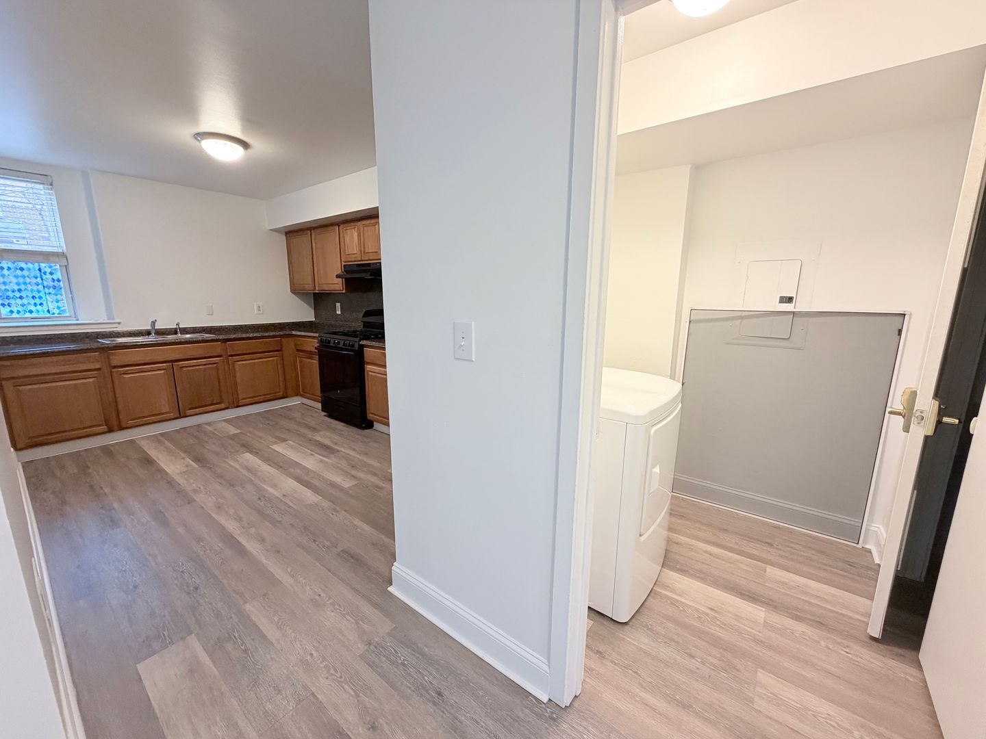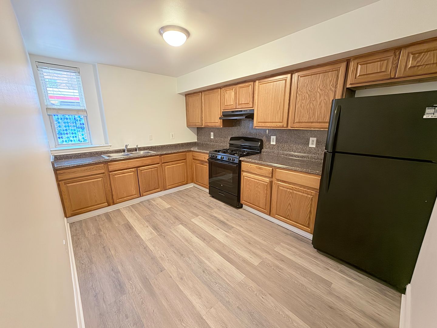 Enter the first floor into your large living room with a coat closet, and through to the kitchen. The spacious kitchen offers tons of counterspace, plenty of cabinets for storage, and gas stove. Also on the first floor is the first bedroom, in unit washer and dryer, and half bathroom for added convenience.