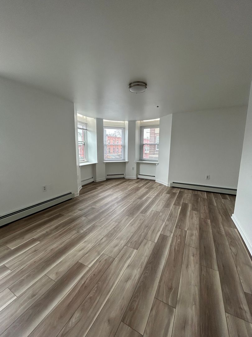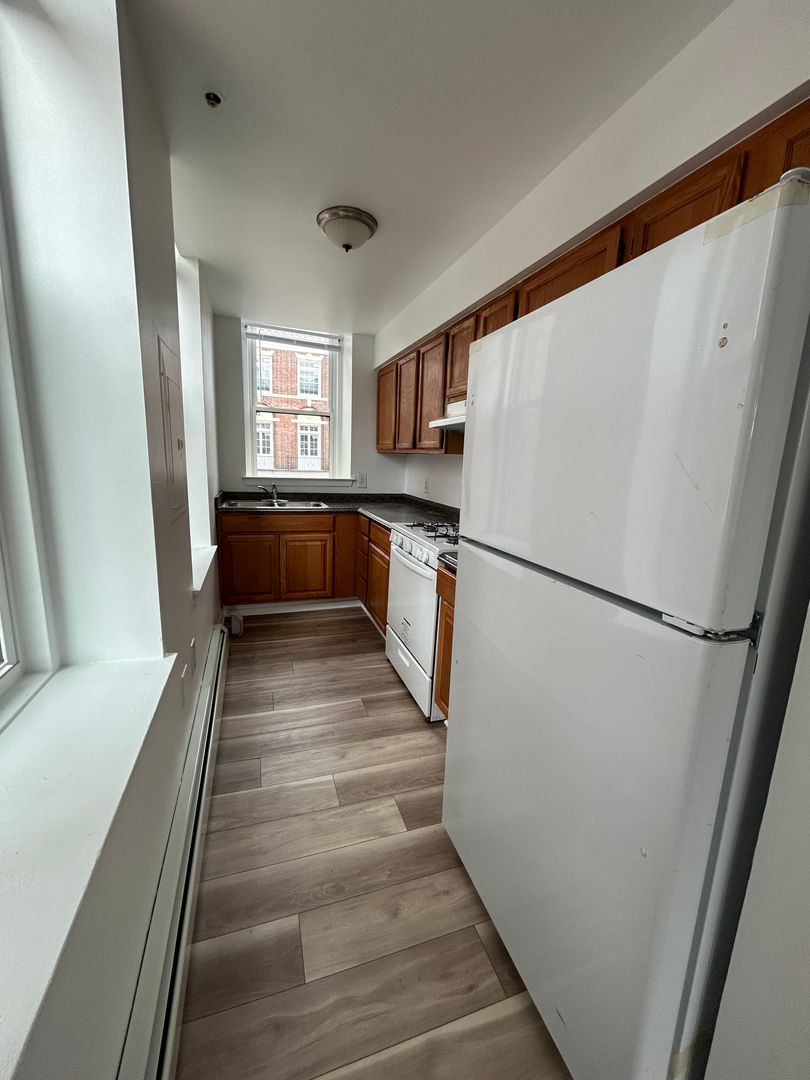 The unit features a galley kitchen with gas stove, ample counterspace, and plenty of cabinets for storage. This corner unit boasts a large and open living room allowing for lots of natural light. Both bedrooms have multiple windows and a large closet. Hardwood floors throughout the apartment. Laundry on site and heat included with rent.