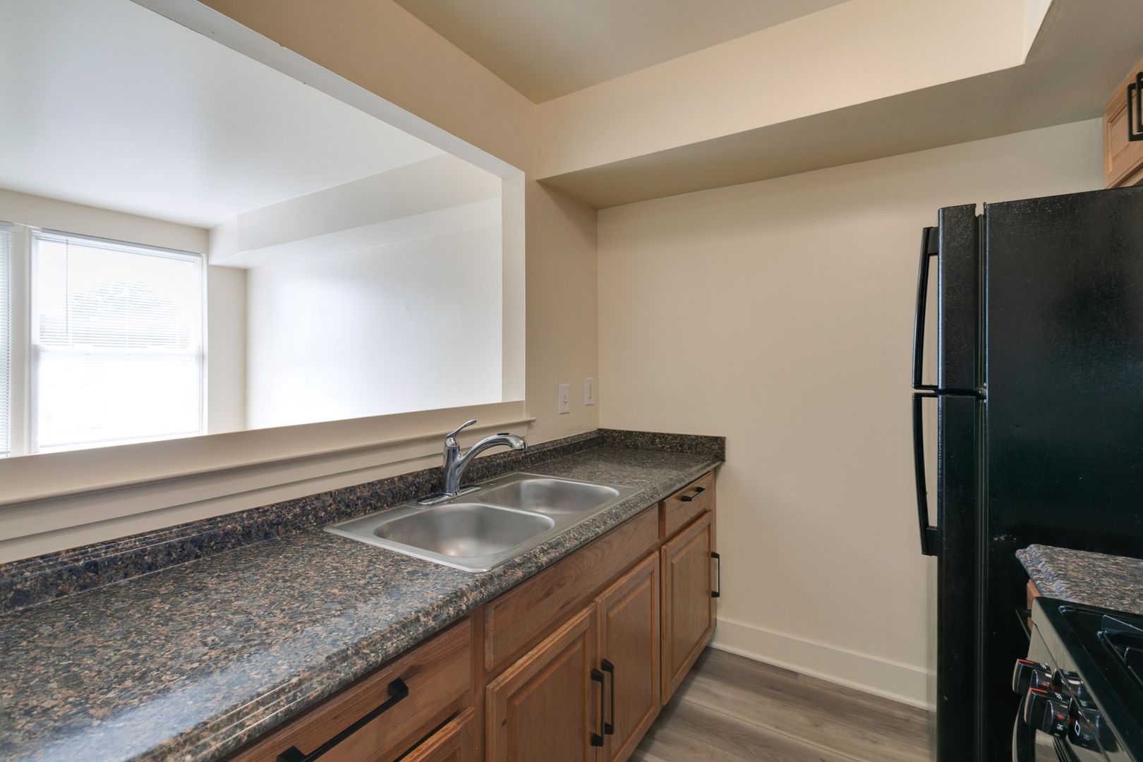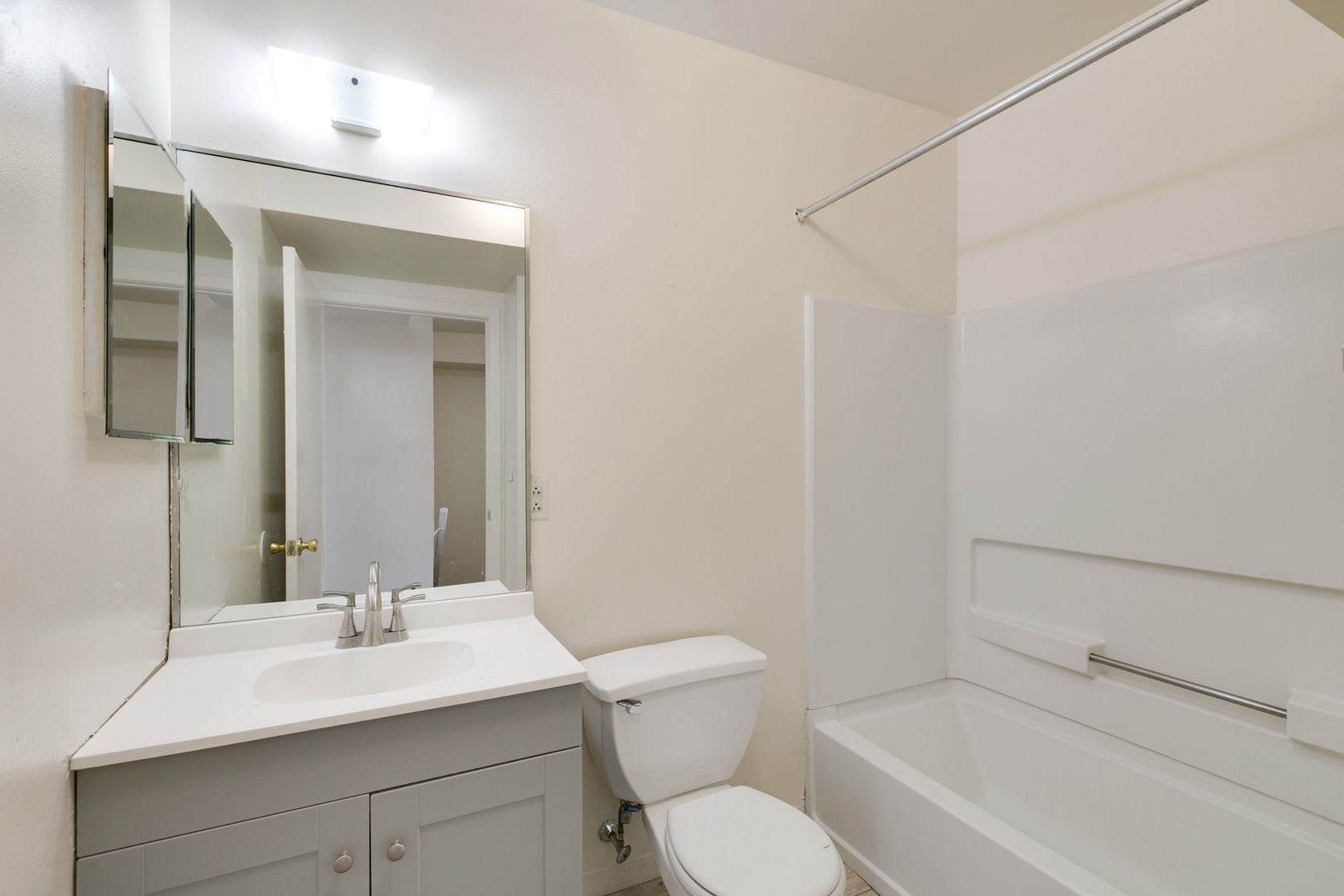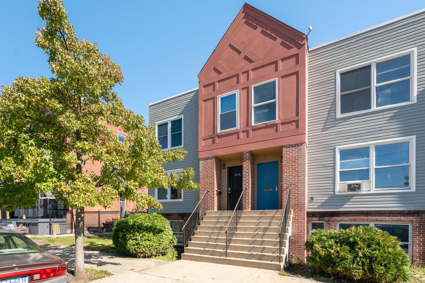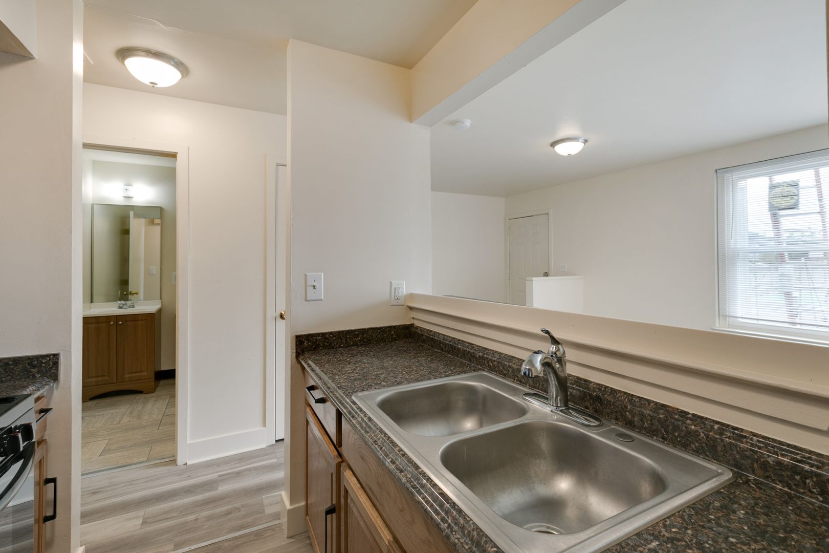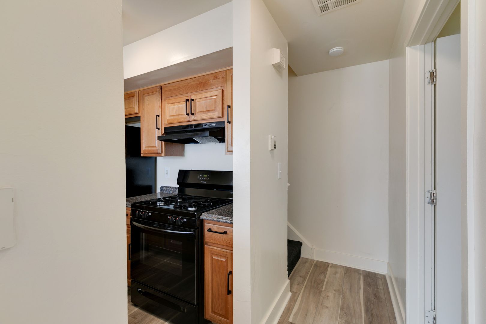 Enter into your spacious, light-filled living room which has two closets and leads directly in the kitchen. The galley kitchen offers lots of counterspace, a double sink, plenty of cabinets for storage, and a gas stove. The first floor boasts a half bath with modern vanity and a medicine cabinet.