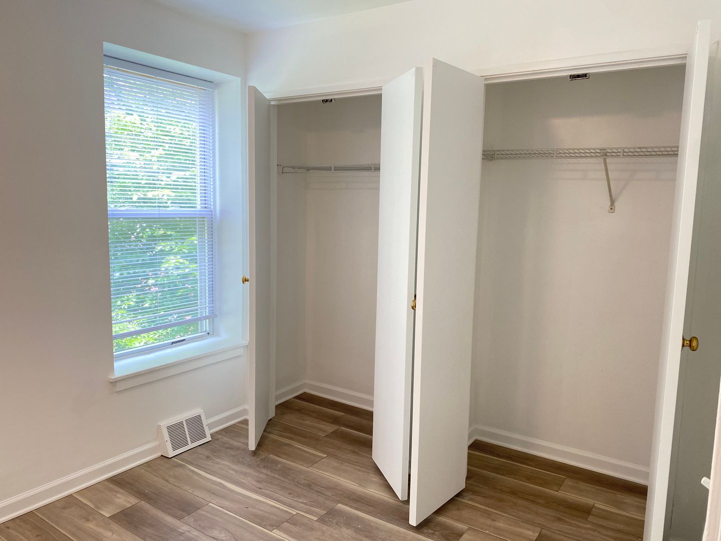 The apartment is on multiple floors and has 2 bedrooms, a nice-sized kitchen, coat/linen closet, open living room, a full bathroom, new blinds, and new paint.